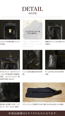 ・ハンドル ・ショルダーストラップ ・外側ポケット×2 ・木刀ホルダー ・本革ネームタッグ付き ・ダブルジッパー ・手づくり限定製作品 |